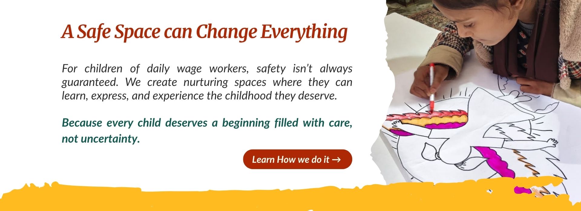 A safe and nurturing environment for the children of informal/daily wage workers living in Urban slums and other socio-economically neglected regions of the city. Our mission is to provide an enjoyable childhood filled with opportunities for growth and learning.